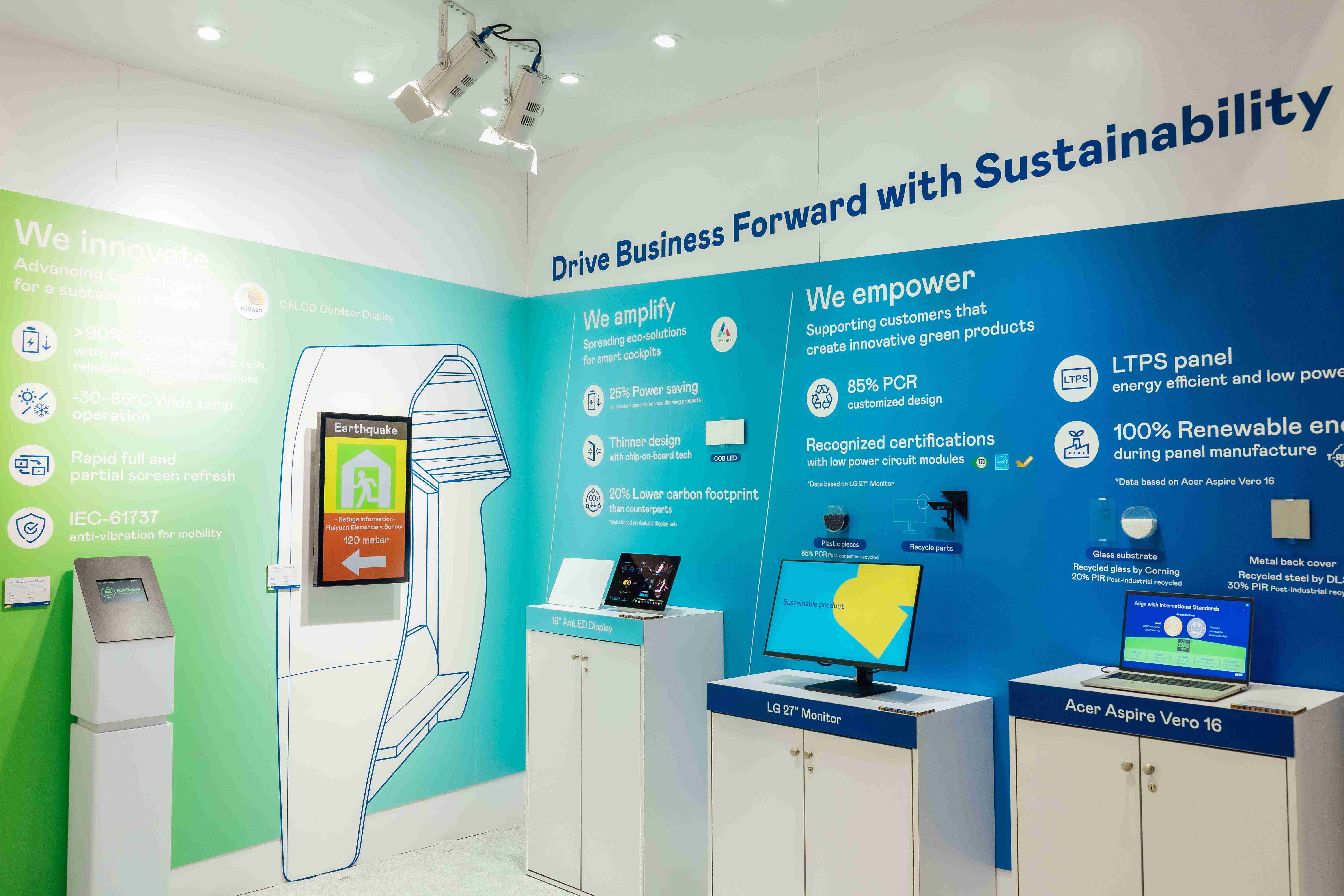 开云电子运用创新显示技术HiRaso胆固醇液晶双稳态技术达到显示零耗能、、、扩大节能省电的AmLED显示技术应用于车用产品、、、、以再生的消费后回收(PCR)塑料及全绿电生产之面板,,,应用于笔电及萤幕,,增加绿色价值。。